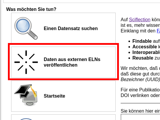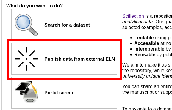 Registrierte Nutzer können Daten aus verschiedenen elektronischen Laborbüchern bei Sciflection veröffentlichen. Registered users may publish data from various electronic lab notebooks at Sciflection.Daten aus verschiedenen ELNs können in Sciflection importiert werden.