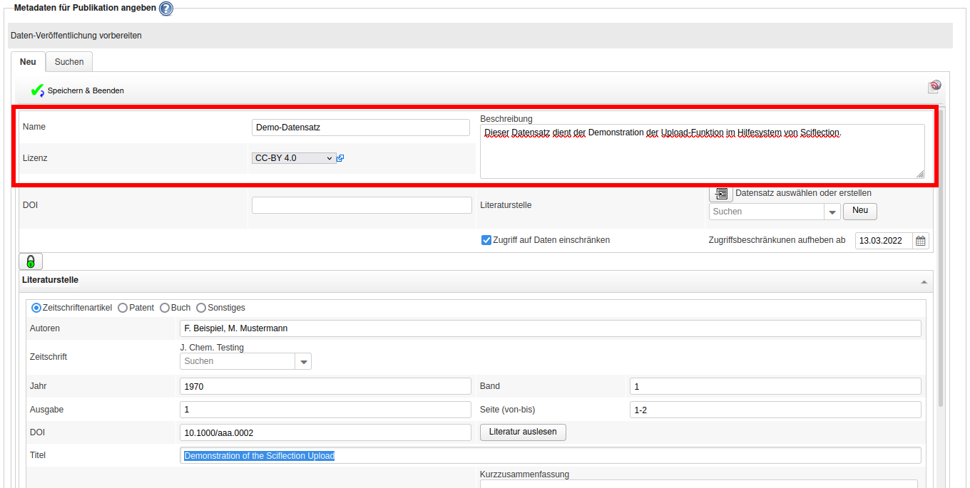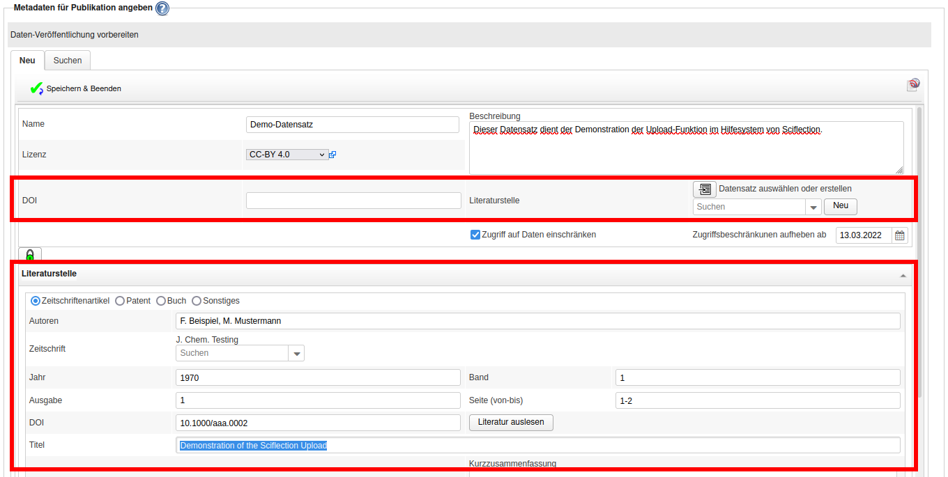 Ist die Daten-Veröffentlichung ein Teil einer Literaturstelle, z.B. einem Artikel in einer Fachzeitschrift, so kann diese Literaturstelle unter "Literaturstelle" bzw. in dem unteren Formular eingetragen werden.