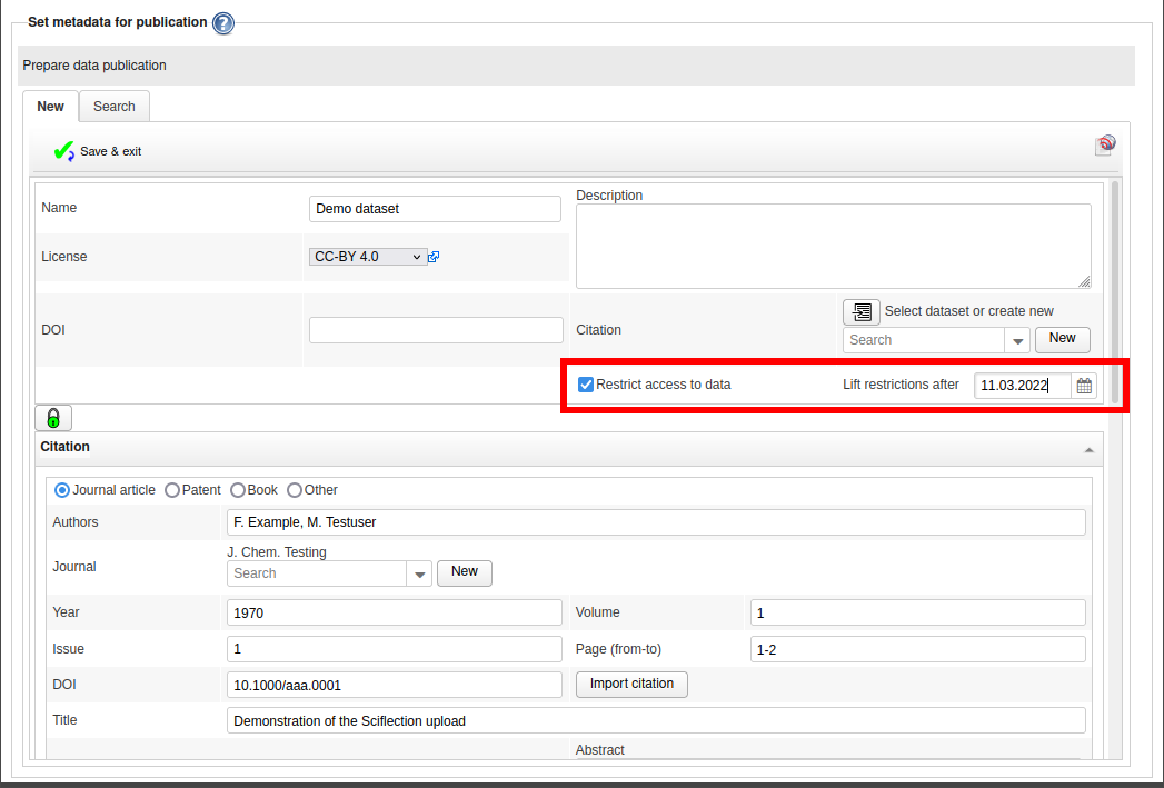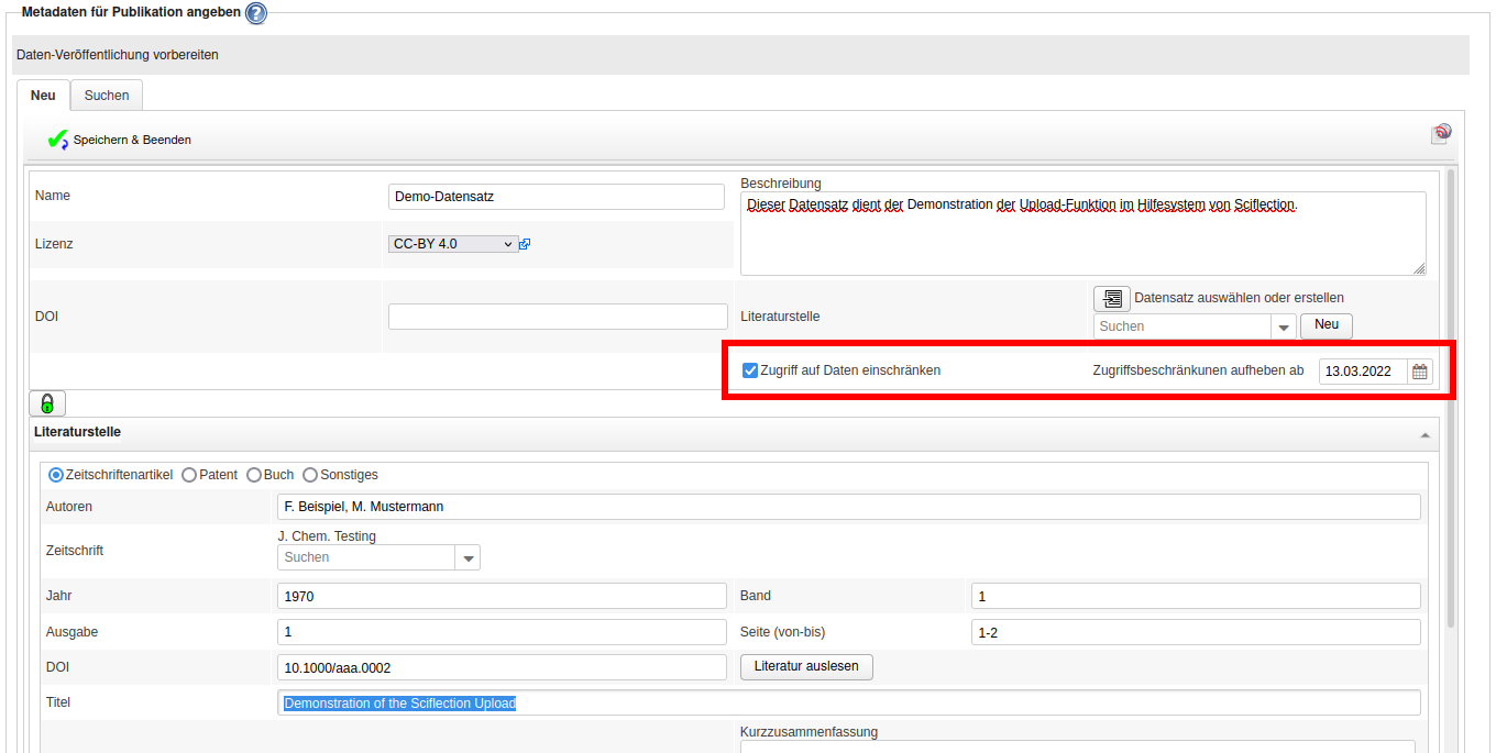 Der Zugriff auf den Datensatz ist bis zu dem angegebenen Datum nur für Sie möglich. Zusätzlich erhalten Sie eine E-Mail mit Zugangsdaten, welche einen Lesezugriff auf den Datensatz ermöglichen. Diese können Sie an Personenn weitergeben, mit denen Sie die Daten teilen möchten.You can choose to restrict access to your dataset using the checkbox "Restrict access to data". You may also choose a date, at which the restrictions will be automatically lifted.