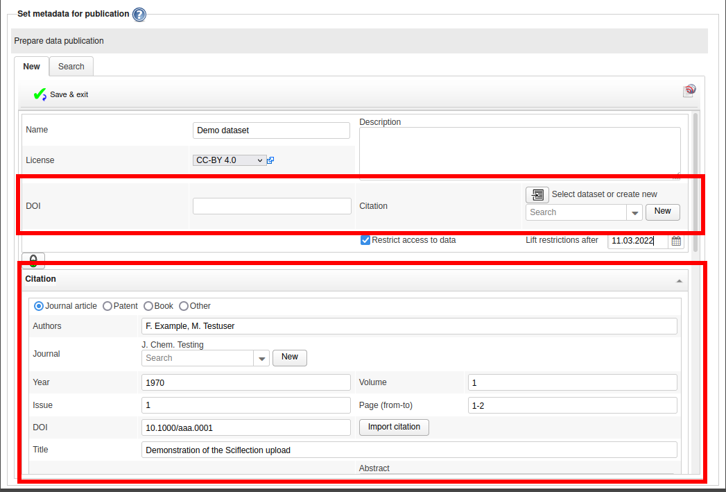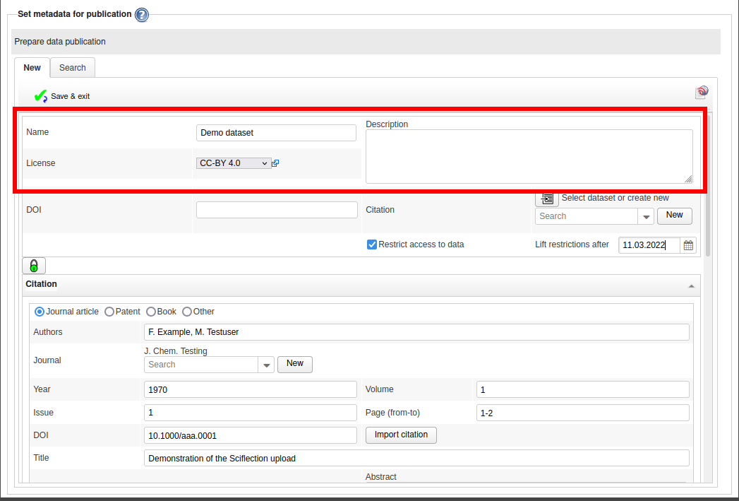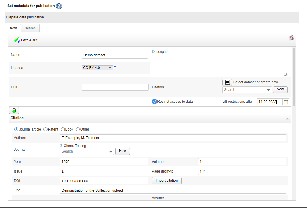 The upper half of the form describes the data publication. This is our term for a collection of experiments and analytical data which can be grouped into one dataset.
